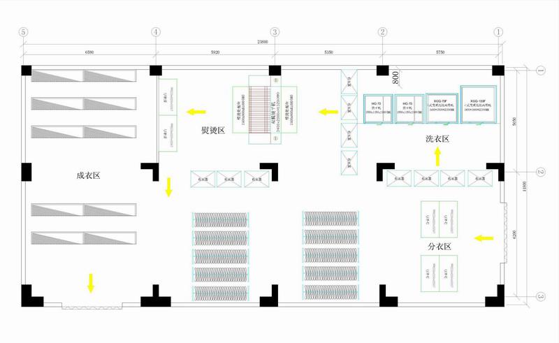 的格局的正方形結構,非常適合洗滌流程的安排,洗滌區域很自然地分割開來,利用了場地資源:以件布草的熨燙折疊為方形的,水洗、烘干、水洗后整理依墻安置為排布方式。